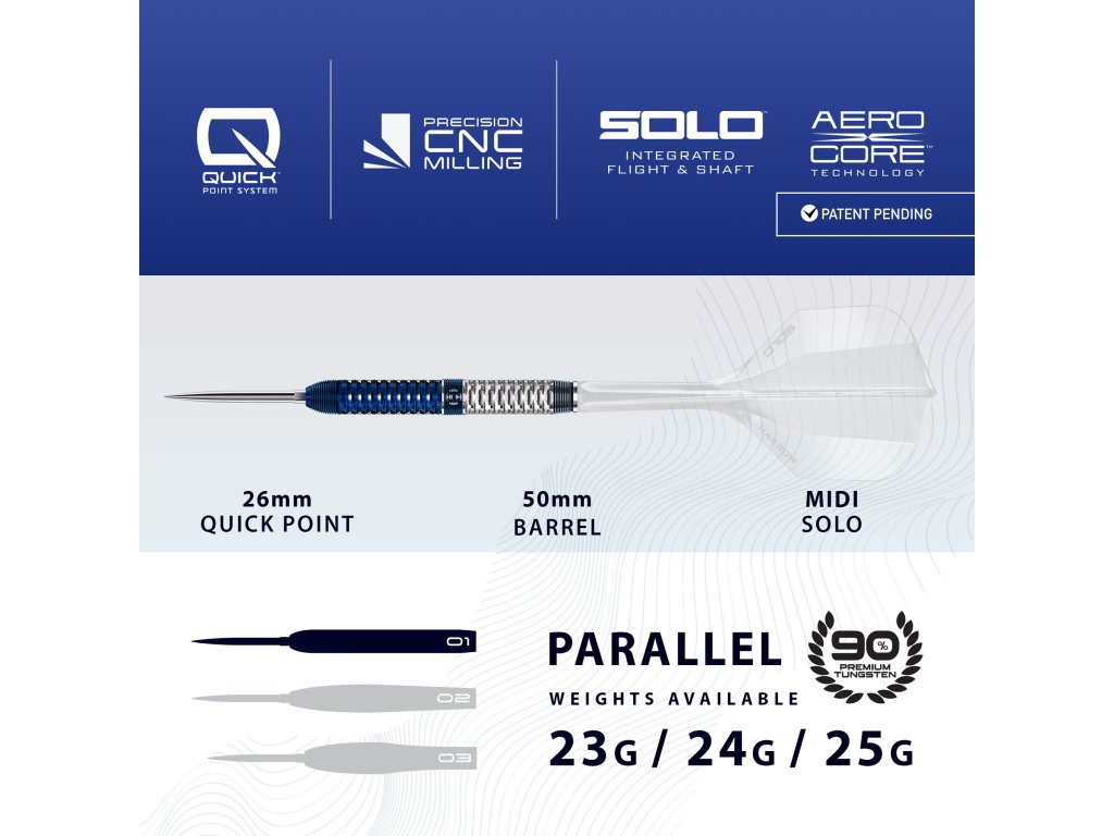 Barel je vyroben z 90 % wolframu a po celé délce je opatřen precizně frézovanými drážkami. Každý detail vznikl na základě důkladného testování a pokročilých výrobních procesů, aby poskytl maximální cit v ruce a konzistentní úchop pro různé styly hodu.
