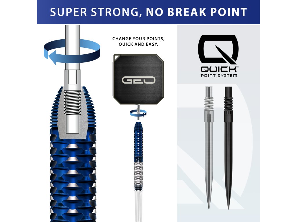 Šipky Geo jsou vybaveny Harrows Quick Point systémem, který umožňuje výměnu délky hrotu během několika sekund. Díky tomu si můžete šipky jednoduše přizpůsobit přesně podle svých preferencí a podmínek hry.
