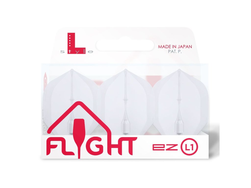 Bílé letky L-Style Champagne Integrated EZ L1 Standard se zabudovaným Champagne Ring systémem, rozměry 36 x 41,7 mm, tloušťkou 0,3 mm a hmotností 0,5 g pro stabilní obloukový let.