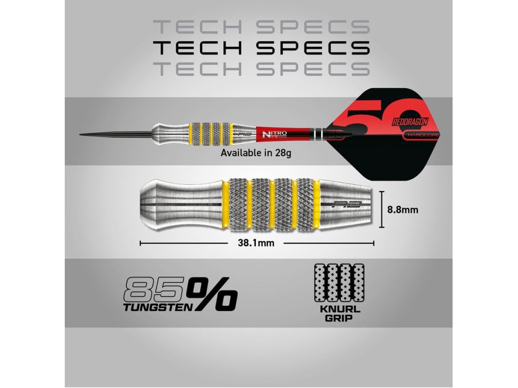 Limitovaná edice Red Dragon Chunky Stumpy 7 šipek s 85% wolframem, 28 g váhou a extrémně krátkým 38,1 mm barelem o průměru 8,8 mm.