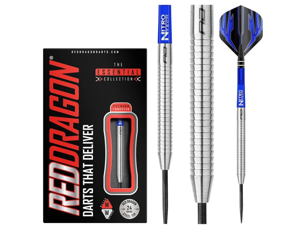 Šipky Red Dragon steel Razor Edge 26g, 85% wolfram, 6,9mm tloušťka, 50,8mm délka, 26g váha, modré Nitrotech násadky, Hardcore extra hrubé letky.