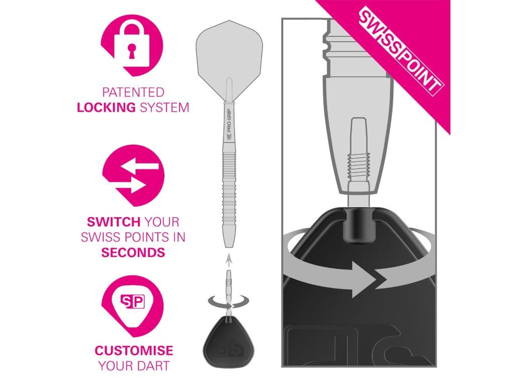 Jednou z revolučních inovací, které Target Darts přinesl do světa šipek, je systém Swiss Points. Tento systém umožňuje hráčům snadno a rychle měnit hroty šípů, aniž by museli vyměňovat celou hlaveň. Tato flexibilita nejen usnadňuje přizpůsobení různým herním situacím nebo osobním preferencím, ale také výrazně zvyšuje trvanlivost a použitelnost šípů.
