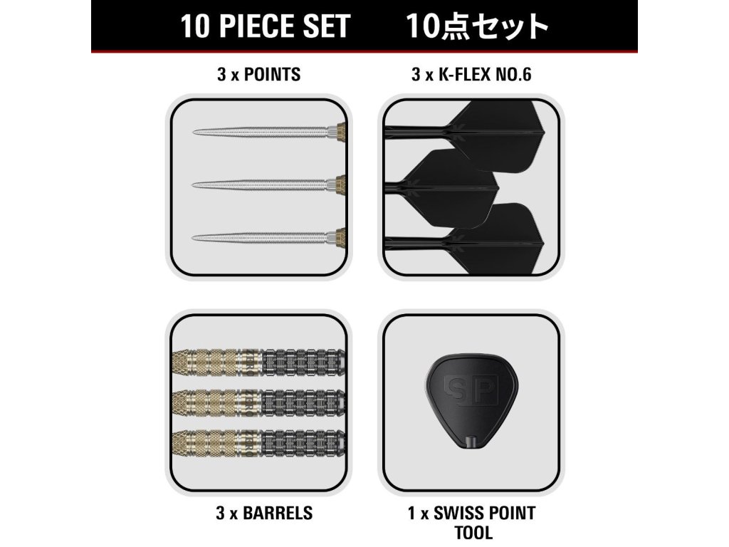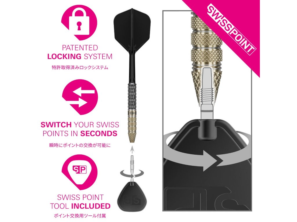 Šipky jsou vybaveny Swiss Point systémem, který umožňuje rychlou a jednoduchou výměnu hrotů pomocí speciálního nástroje. Hroty jsou pevně uchyceny během hry, ale jejich výměna je otázkou několika sekund, což zvyšuje flexibilitu a komfort při používání.