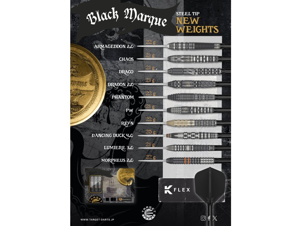 Ocelové šipky Target Japan Black Marque Lite Reyn Generation 1 byly vyvinuty ve spolupráci s profesionálním hráčem. Model Lite G2 představuje odlehčenou a precizně vyváženou verzi série Black Marque, navrženou pro hráče, kteří vyžadují kontrolu, přesnost a čistý herní projev.