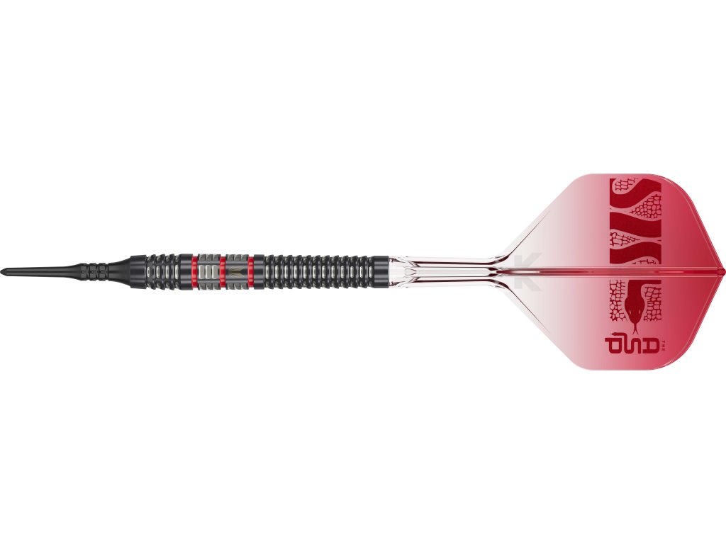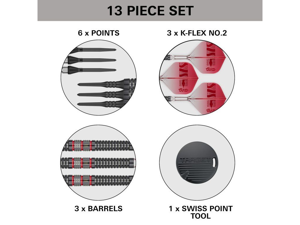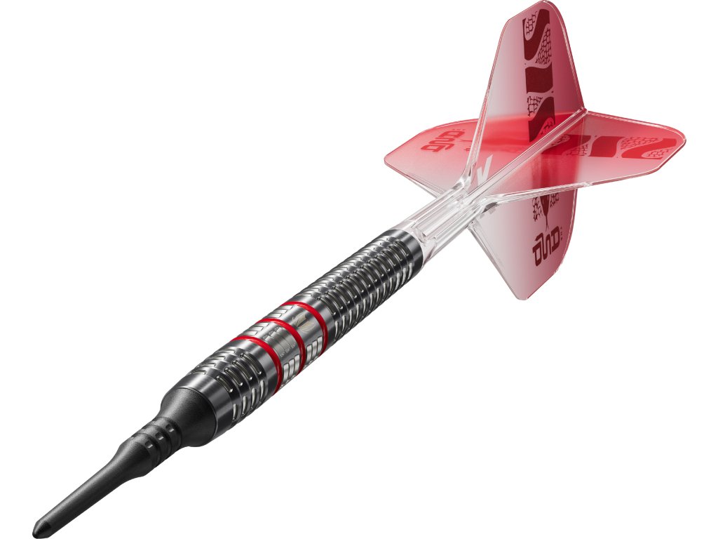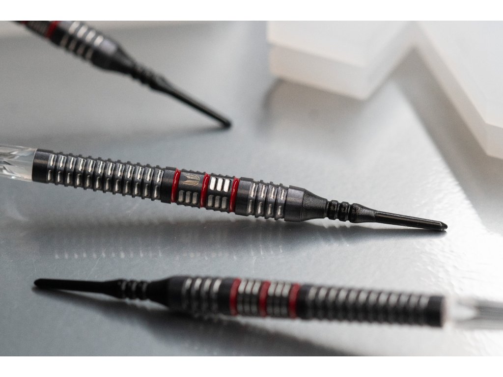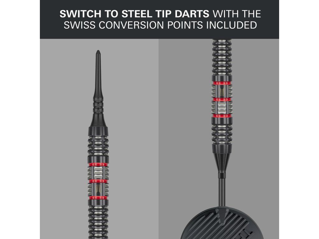 Šipky jsou osazeny černými Pixel Tips hroty, které díky mikro-grip technologii zaručují pevné uchycení v terči a snižují počet odrazů. Součástí jsou i titanové konverzní hroty (30 mm), které umožňují snadný přechod mezi soft tip a steel tip formáty. V balení naleznete i prémiový Swiss Point nástroj, který zajišťuje rychlou a bezpečnou výměnu hrotů.