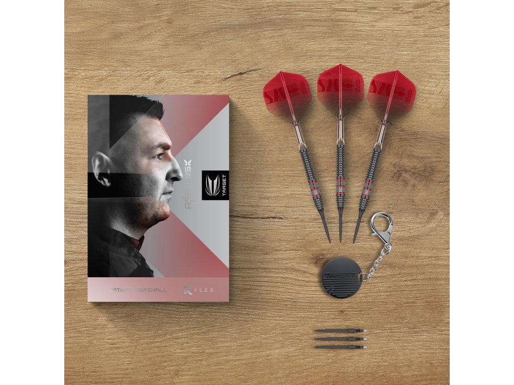 Steel šipky Target Nathan Aspinall 95K, 95% wolfram. Prémiová edice s černým PVD povrchem a K-Flex letkami.