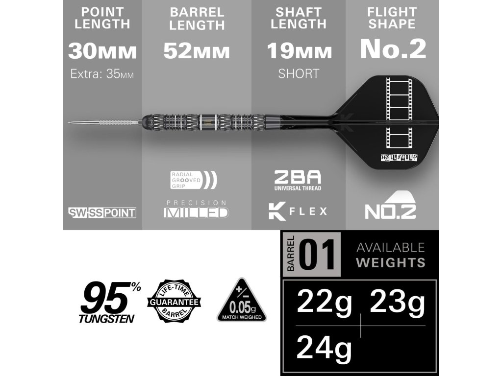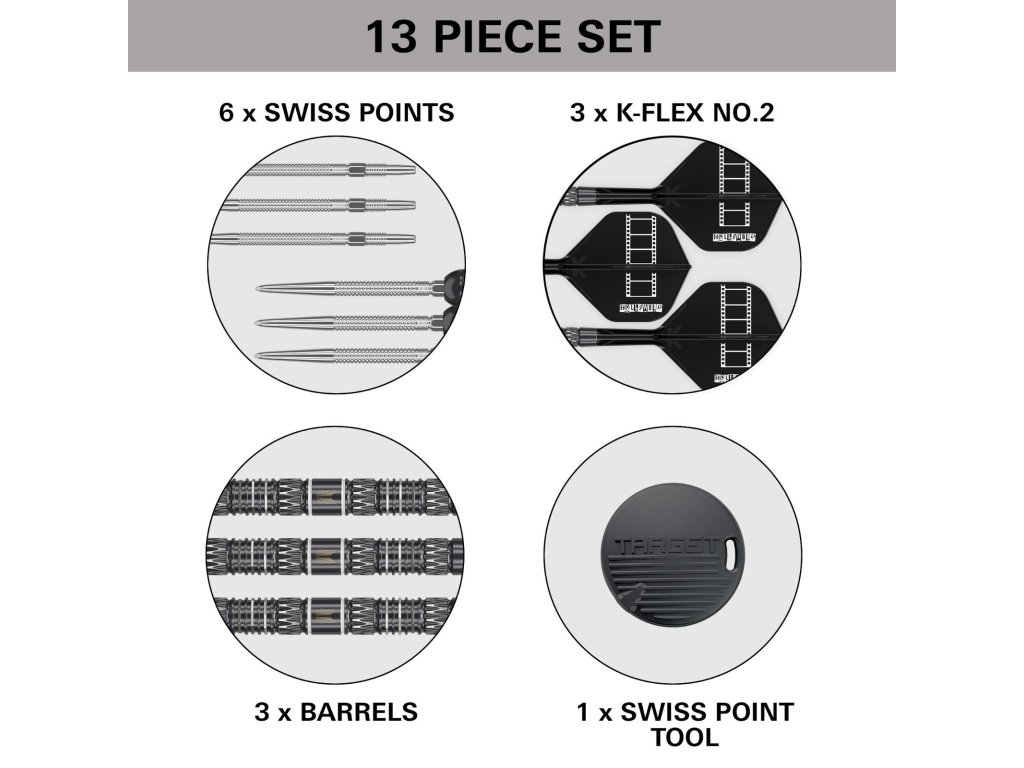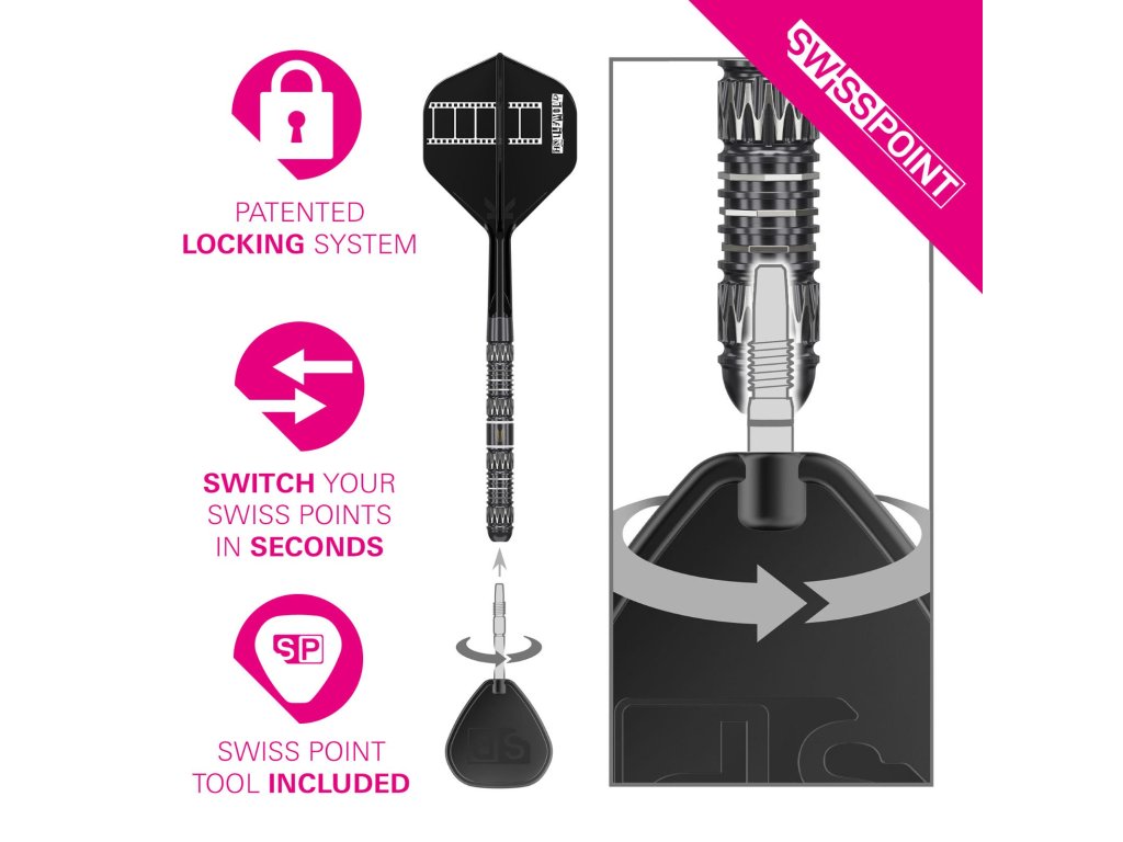 Šipky jsou vybaveny Swiss GRD hroty v délkách 30 mm a 35 mm, což umožňuje přizpůsobit chování šipky podle individuální techniky hodu. Díky Swiss Point systému je výměna hrotů rychlá, bezpečná a jednoduchá pomocí přiloženého nástroje.