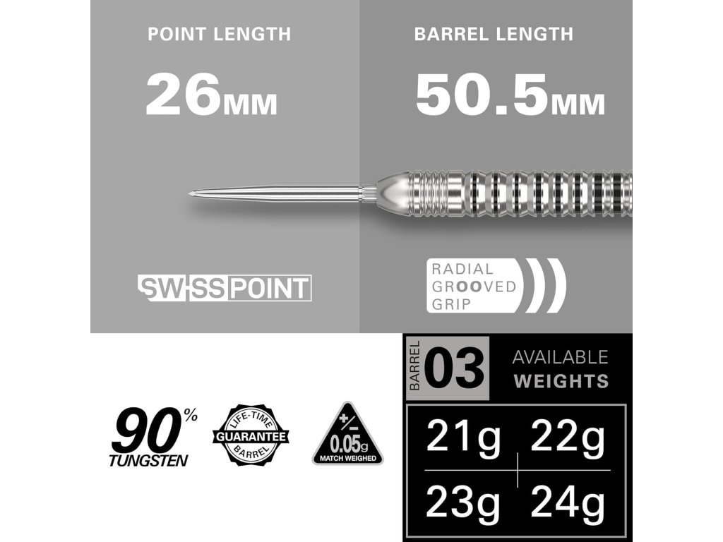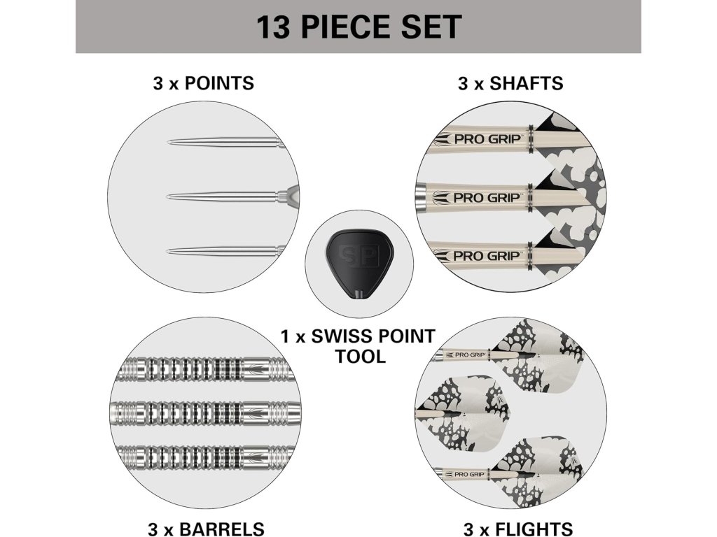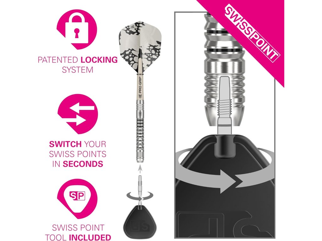 Technologie Swiss Point umožňuje rychlou a snadnou výměnu hrotu pomocí přiloženého nástroje. Tato technologie zajišťuje bezpečnou a stabilní polohu hrotů, což přispívá ke stabilitě a přesnosti každého hodu.