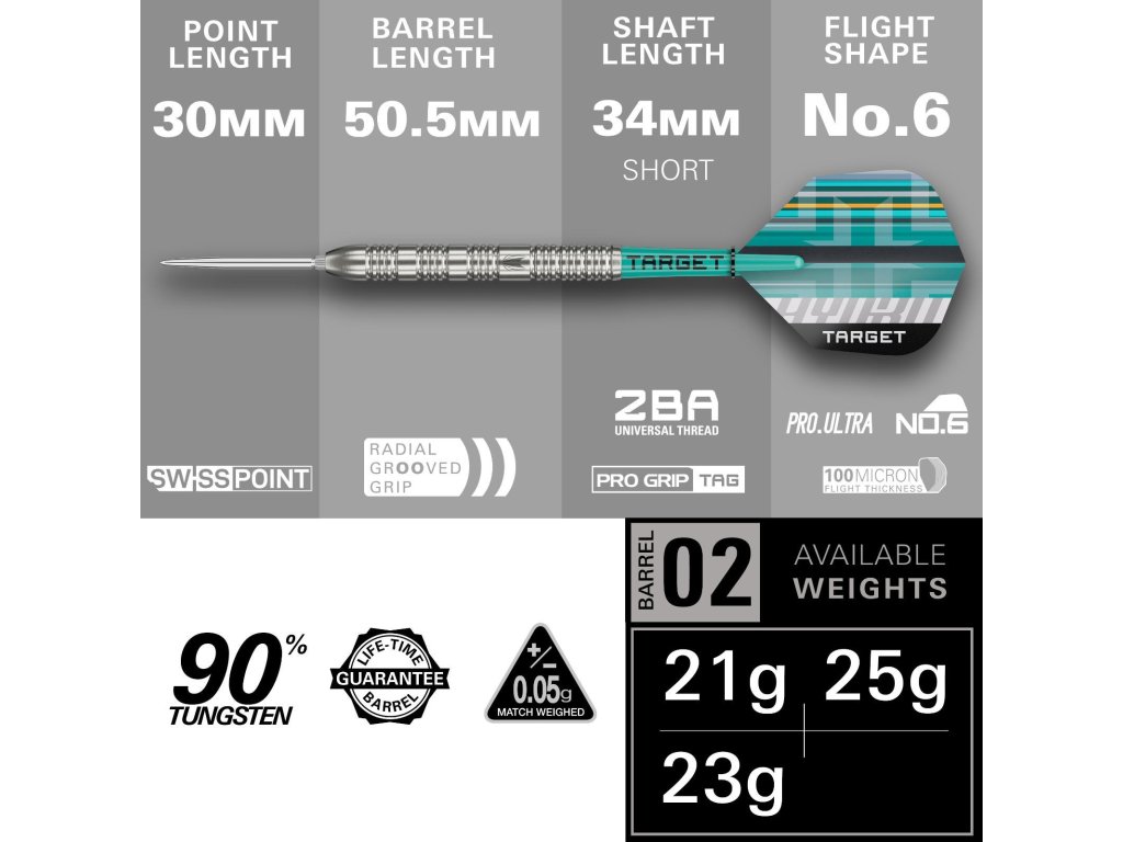 Target Hydro 02 Swiss Point 90% (25 g) jsou profesionální šipky určené pro hráče, kteří upřednostňují těžší šipky s vynikající stabilitou a precizním letem. Díky 90 % wolframu (tungstenu) nabízejí vysokou odolnost, tenký profil a dokonalé středové vyvážení. Agresivní ringed grip poskytuje jistotu a kontrolu při každém hodu, zatímco systém Swiss Point umožňuje rychlou a jednoduchou výměnu hrotů bez použití nářadí.
