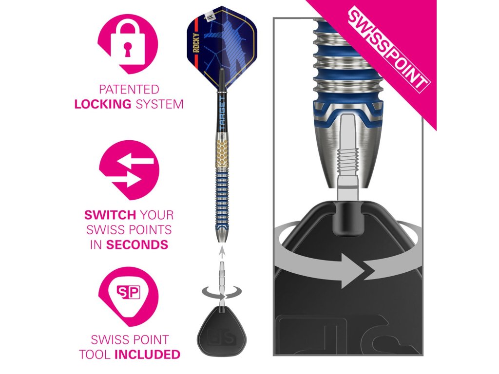 Jednou z revolučních inovací, které Target Darts přinesl do světa šipek, je systém Swiss Points. Tento systém umožňuje hráčům snadno a rychle měnit hroty šípů, aniž by museli vyměňovat celou hlaveň. Tato flexibilita nejen usnadňuje přizpůsobení různým herním situacím nebo osobním preferencím, ale také výrazně zvyšuje trvanlivost a použitelnost šípů.