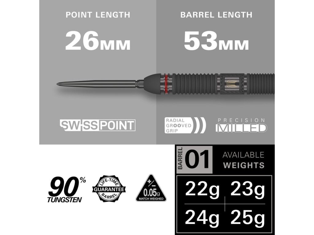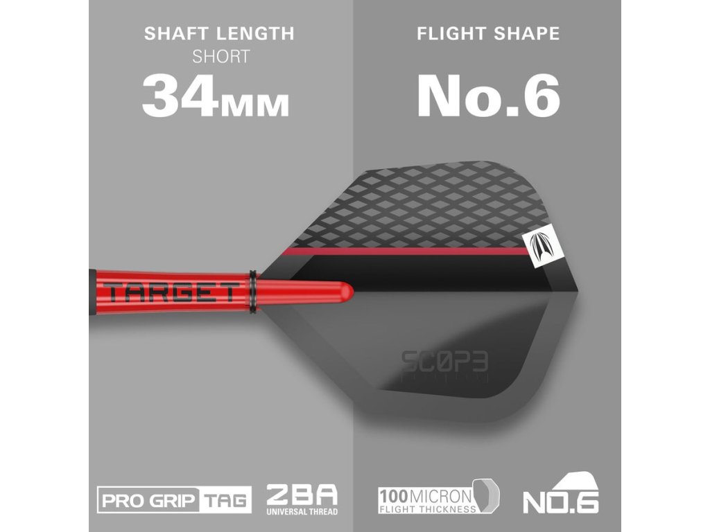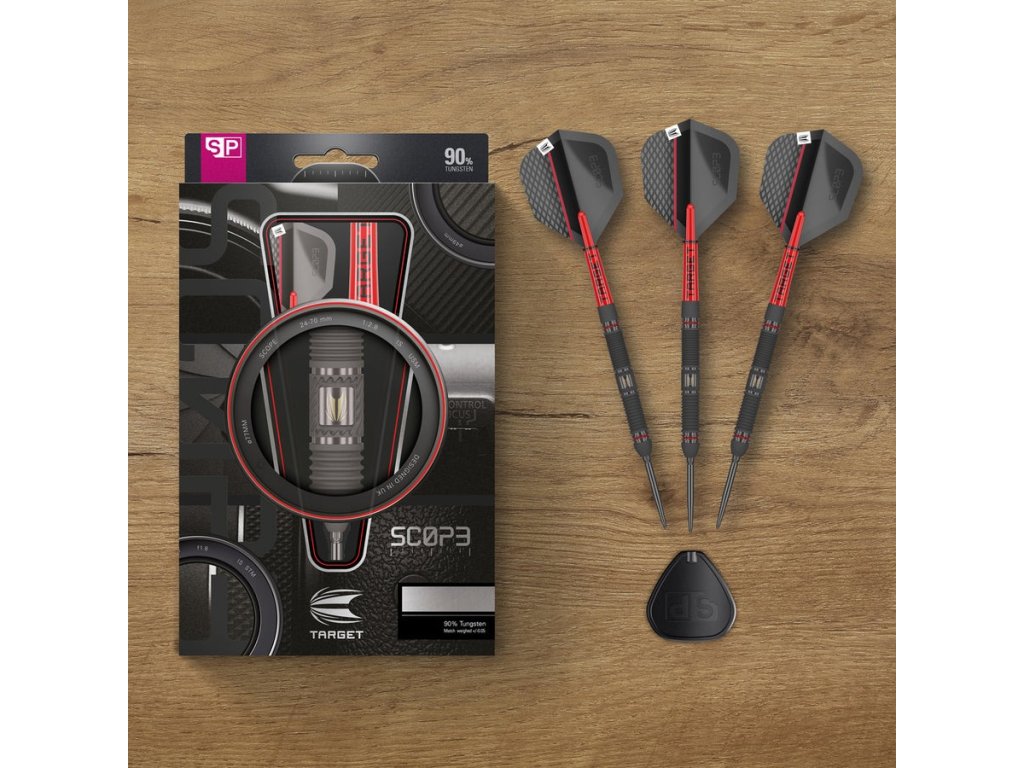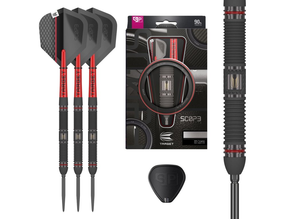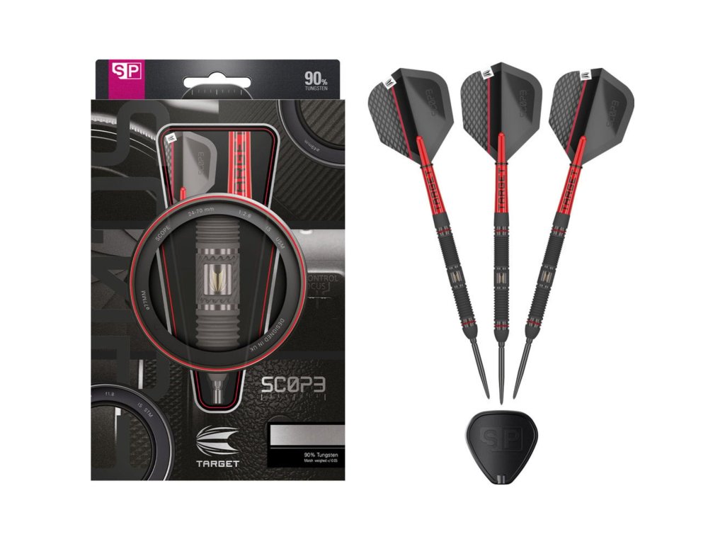 Šipky Scope 01 jsou navrženy pro hráče, kteří požadují dokonalý úchop, precizní zpracování a elegantní design. Barel vyrobený z 90 % wolframu má rovný tvar a je pokrytý černou PVD vrstvou pro matný vzhled a zvýšenou odolnost.