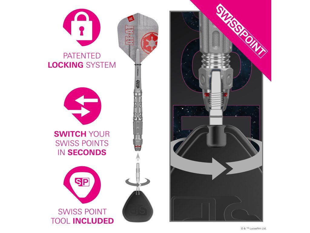 Target STAR WARS™ AT-AT 90% Steel Tip jsou šipky inspirované ikonickým AT-AT walkerem ze světa Star Wars™. Rovný barrel z 90% wolframu s kombinací radiálního a frézovaného gripu poskytuje přesnou kontrolu a plynulý hod, doplněný o Swiss Point systém pro rychlou výměnu hrotů.