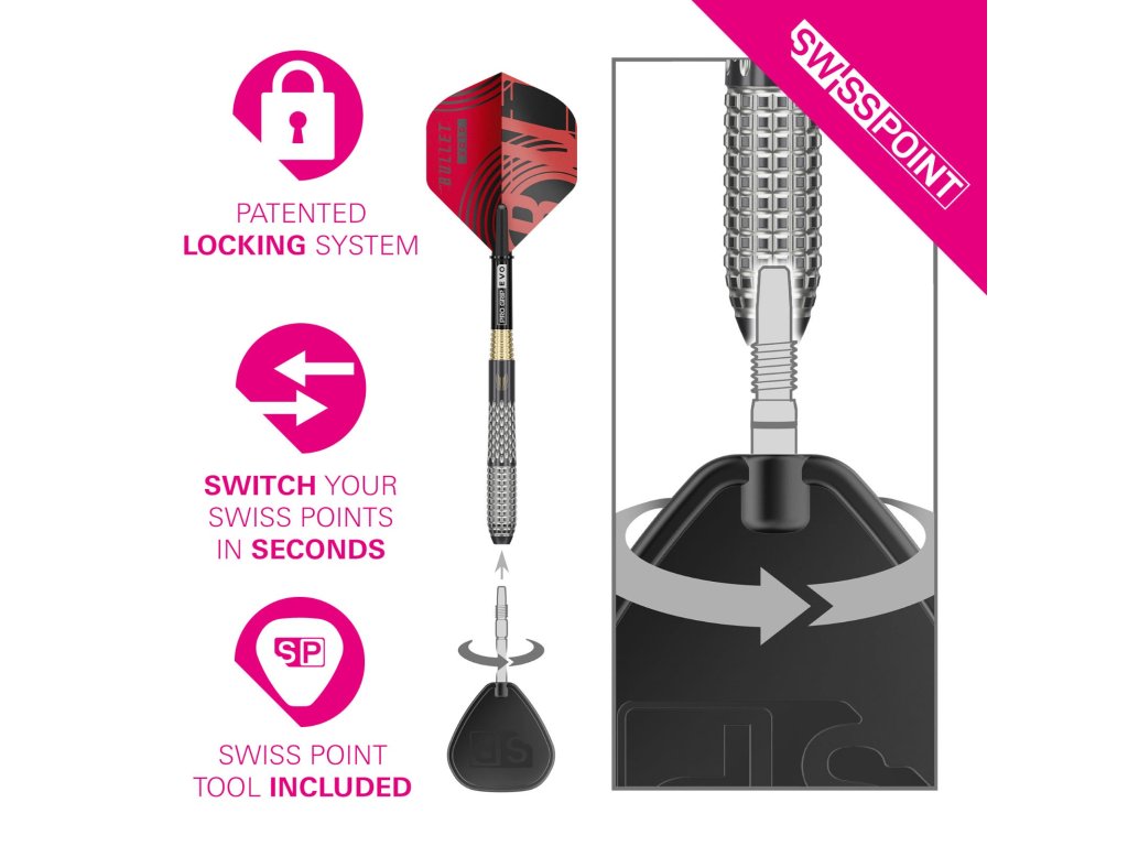 Šipky jsou osazeny zlatými Swiss Point hroty (30 mm), které zajišťují pevné spojení mezi tělem šipky a terčem a čistý vstup do sisalu. Patentovaný Swiss Point systém umožňuje rychlou a jednoduchou výměnu hrotů pomocí přiloženého nástroje, bez kompromisů ve stabilitě nebo spolehlivosti.