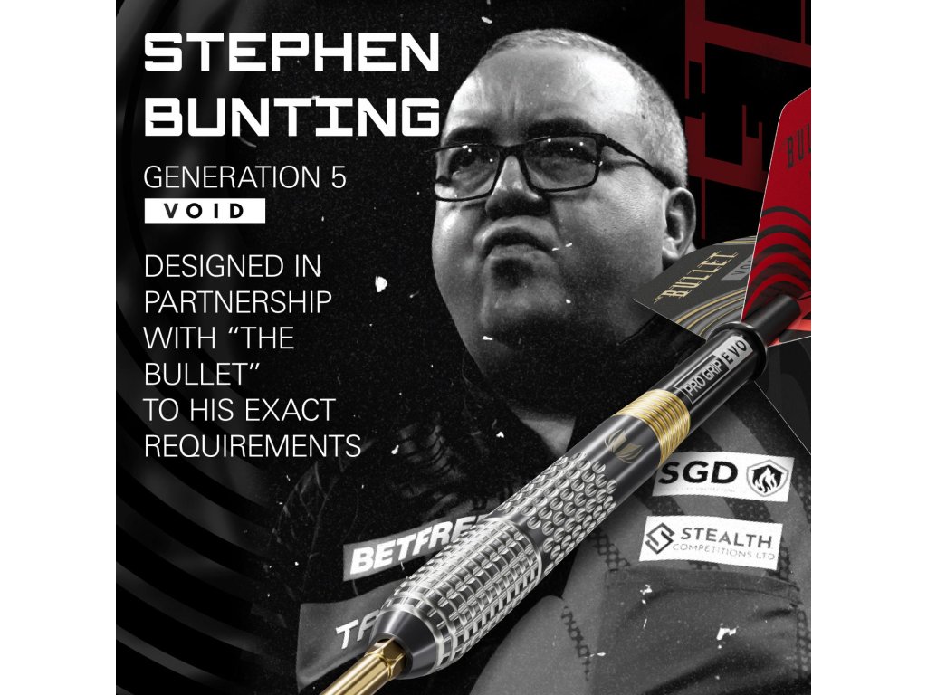 Stephen Bunting Pátá generace Void 95% byly vytvořeny v úzké spolupráci s vítězem World Masters 2024 – Stephenem Buntingem. Tento model dokonale odráží jeho klidný projev, technickou přesnost a neúnavnou schopnost skórovat pod tlakem. Pátá generace vznikla na základě rozsáhlého testování a dolaďování detailů, aby nabídla maximální konzistenci, kontrolu a jistotu při hodu.