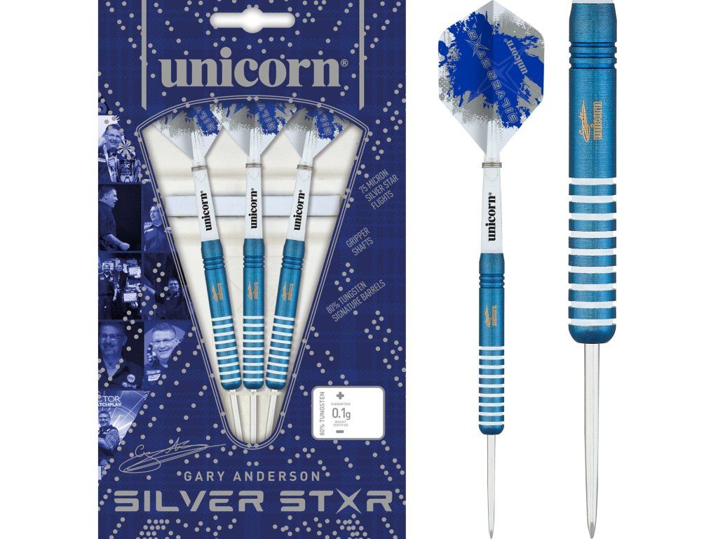 Unicorn Gary Anderson Silver Star 80% jsou ocelové šipky navržené podle preferencí Garyho Andersona. Díky rovnému tělíčku z 80 % wolframu, jemnému kroužkovému úchopu a středovému vyvážení nabízejí plynulý a přirozený pocit při hodu.