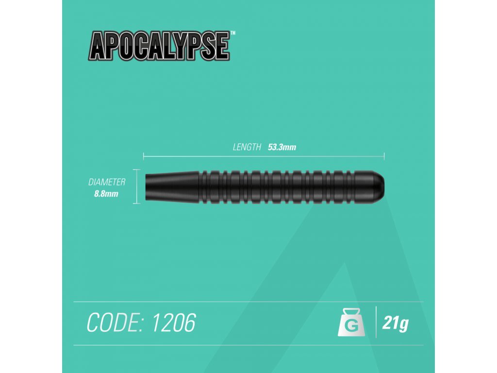 Winmau Apocalypse šipky jsou ideální pro nováčky v šipkách. Tyto steel šipky, vybavené pevnými kovovými hroty, jsou speciálně navrženy pro použití s sisalovými terči. Každá šipka váží 19 gramů a je vyrobena z černého mědi s pravidelnými drážkami, měří 8 mm v průměru a 55,88 mm na délku. Komplet je obohacený o Prism násadky a Prism Alpha letky ve standardním designu.