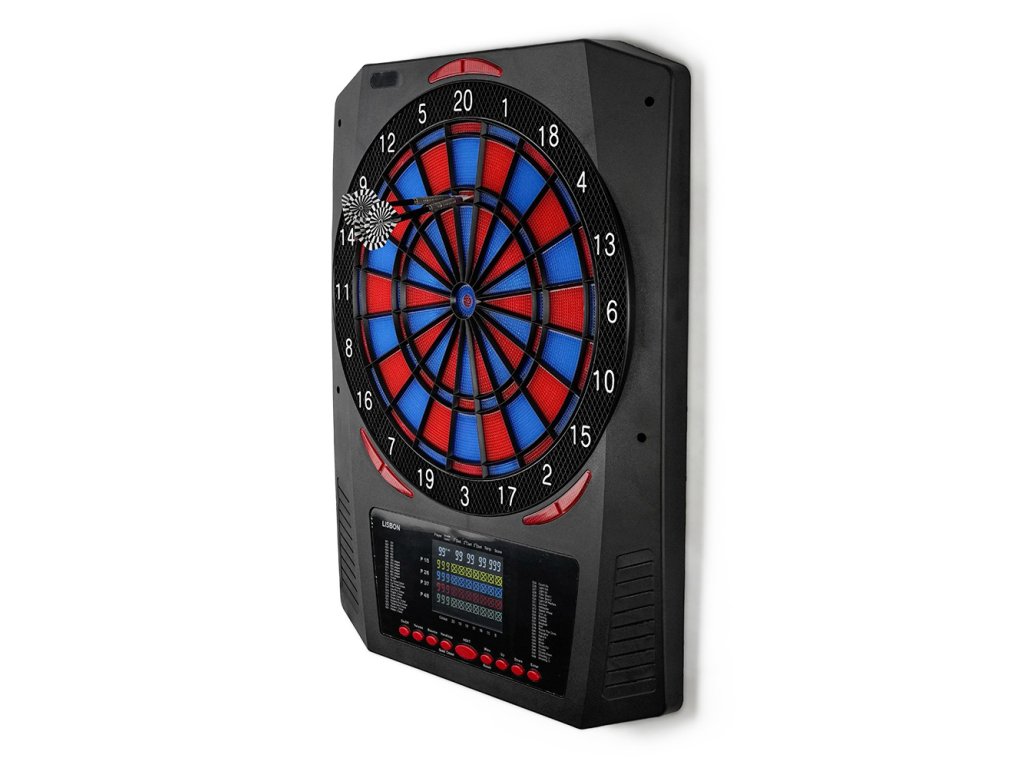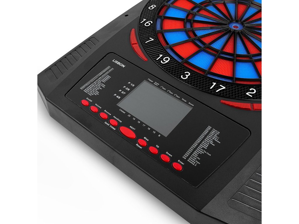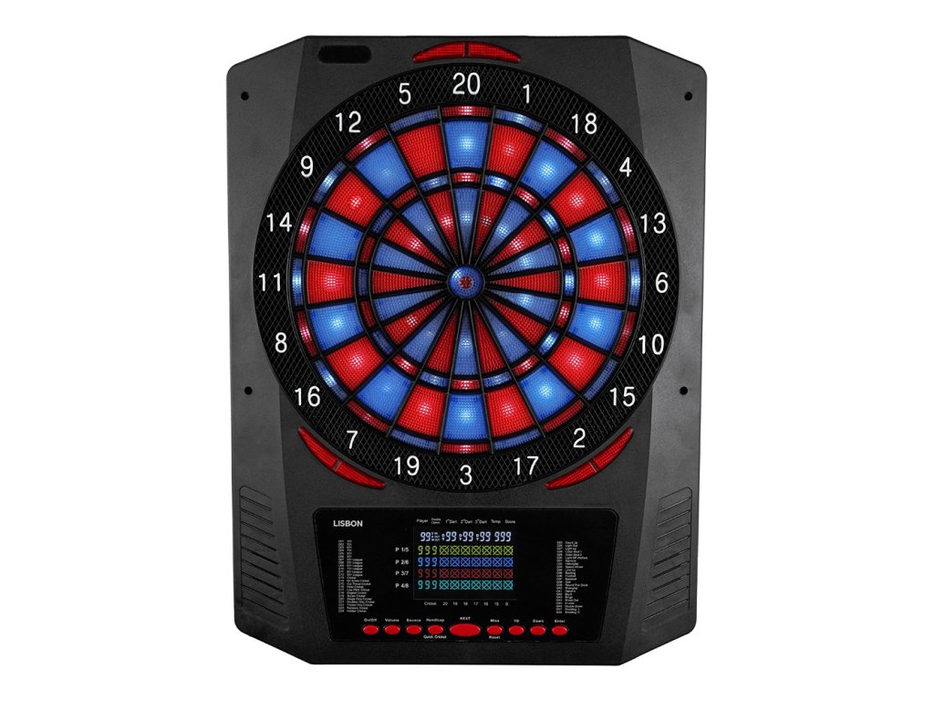 Elektronický terč XQ MAX Lisbon s osvětlenými segmenty, 48 hrami, 315 variantami, možností hry pro 1-8 hráčů nebo proti počítači, dodávaný s kompletní sadou šipek a adaptérem.