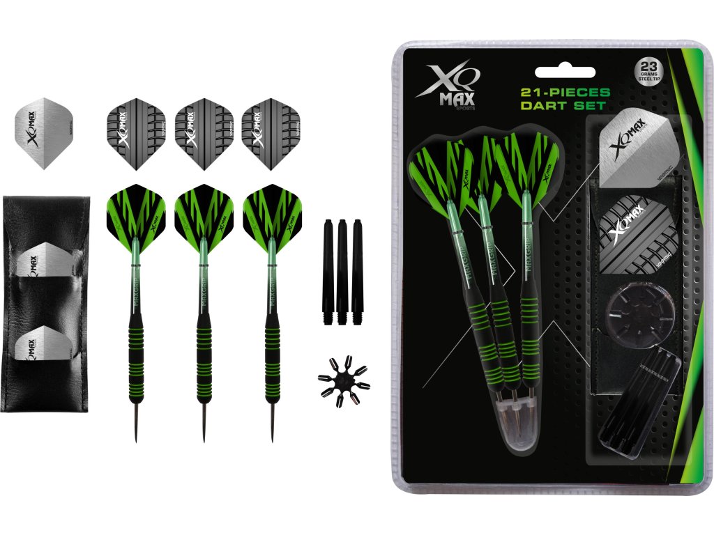 XQ Max BK GN Stripes ST je kompletní set šipek s moderním černým designem se zelenými pruhy. Obsahuje 21 dílů a nabízí všechno potřebné pro okamžité hraní i jednoduché přizpůsobení šipek.